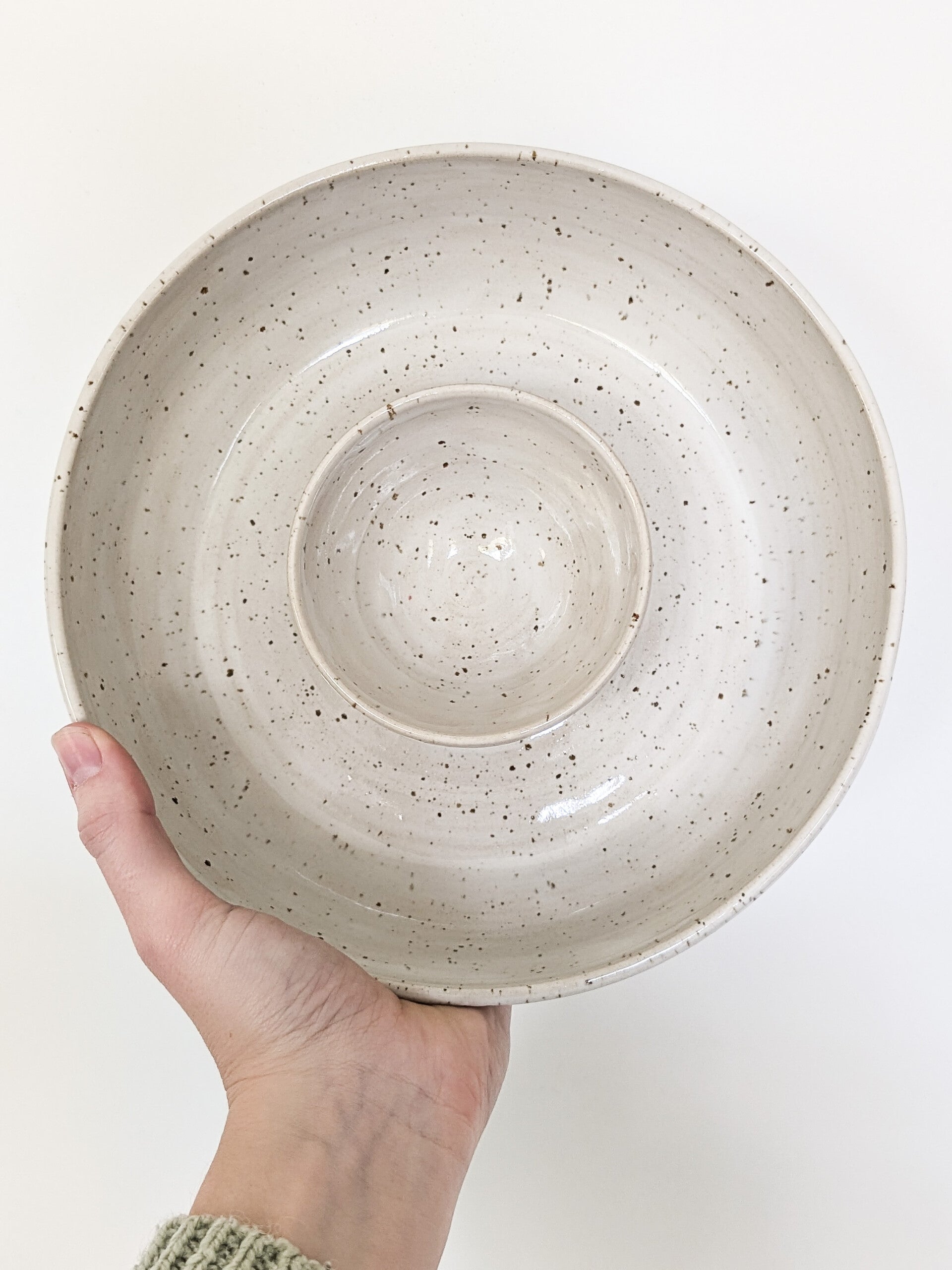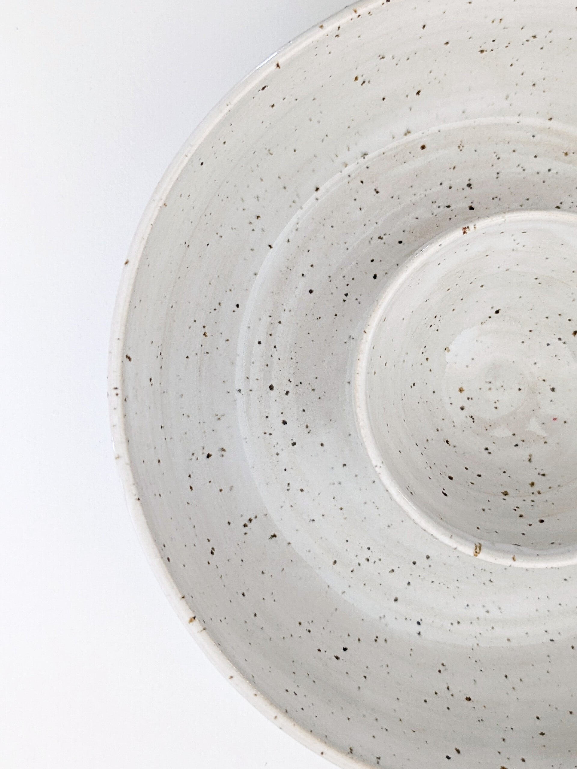 Een prachtige Chip & Dip schaal, gemaakt van spikkel klei met een prachtig wit glanzend glazuur.